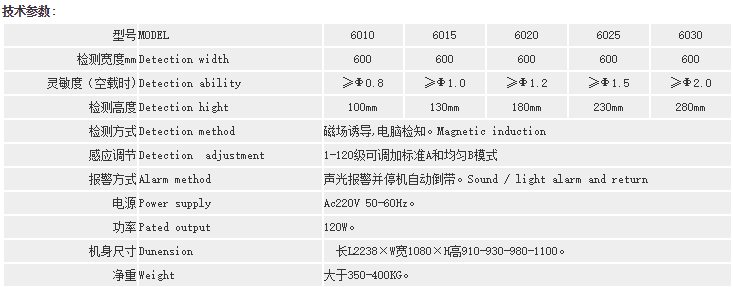 說明:檢針機靈敏度的高低由檢測高度(即通道或龍門)來決定最高檢測精度。龍門越高,靈敏度就相應降低。以上對應的高度和檢測標準是在空機狀態(tài)下的檢測結(jié)果;檢測通道高度和寬度,都可以按要求定做!