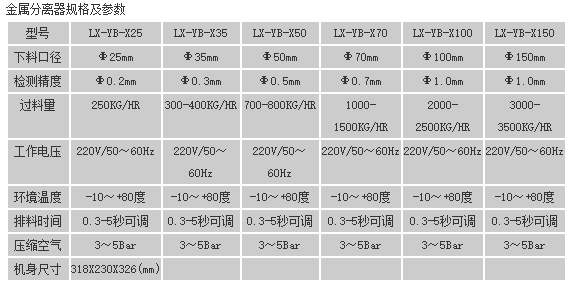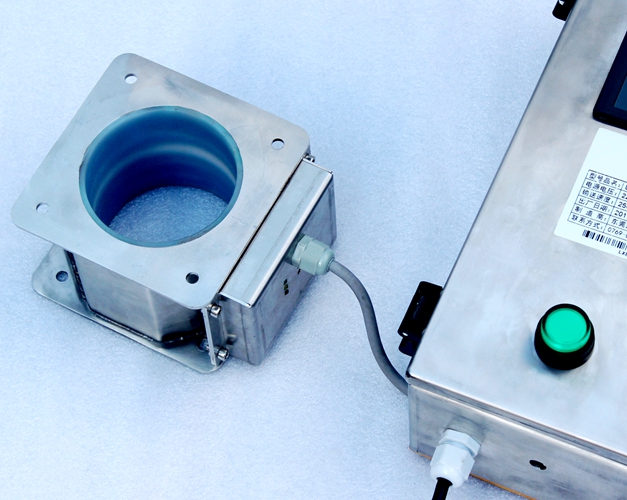 原料從料斗或送料器自由下落進(jìn)入金屬分離器,如果沒有金屬雜質(zhì),原料會直接通過金屬分離器流向下端的出料口。如果檢測器檢測到原料中含有金屬,那么控制器立刻啟動(dòng)分離板將金屬物和部分原料一起導(dǎo)向側(cè)面的排料口,然后分流板迅速恢復(fù)至正常的位置,分流板速度可調(diào),金屬分離器的檢測精度也可根據(jù)生產(chǎn)需要調(diào)節(jié),最小可檢測并分離出Φ 0.2mm的金屬顆粒。