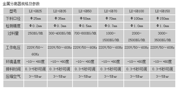 原料從料斗或送料器自由下落進入金屬分離器,如果沒有金屬雜質(zhì),原料會直接通過金屬分離器流向下端的出料口。如果檢測器檢測到原料中含有金屬,那么控制器立刻啟動分離板將金屬物和部分原料一起導向側(cè)面的排料口,然后分流板迅速恢復至正常的位置,分流板速度可調(diào),金屬分離器的檢測精度也可根據(jù)生產(chǎn)需要調(diào)節(jié),最小可檢測并分離出Φ 0.2mm的金屬顆粒。