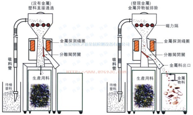 1.專為粉末狀及顆粒狀產(chǎn)品設(shè)計的在線檢測裝置,由管道自由下落通道及探測器和排除裝置完美結(jié)合組成。具有高靈敏度與高抗干擾力。